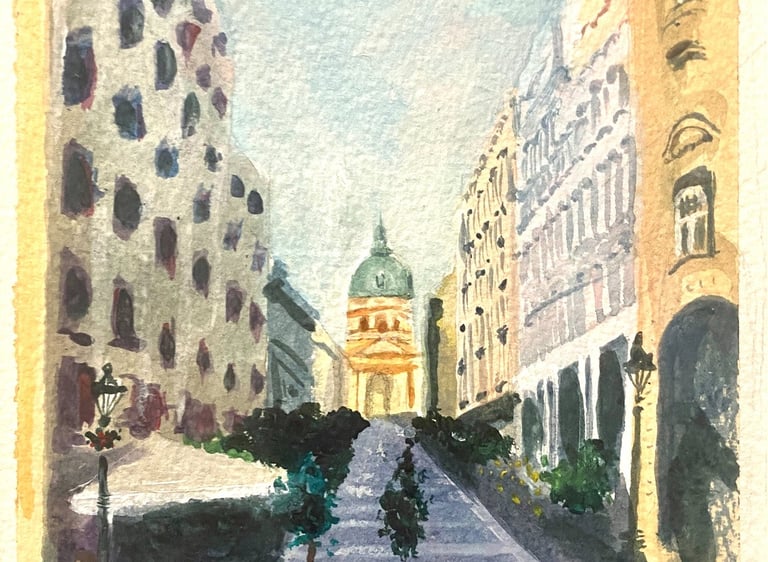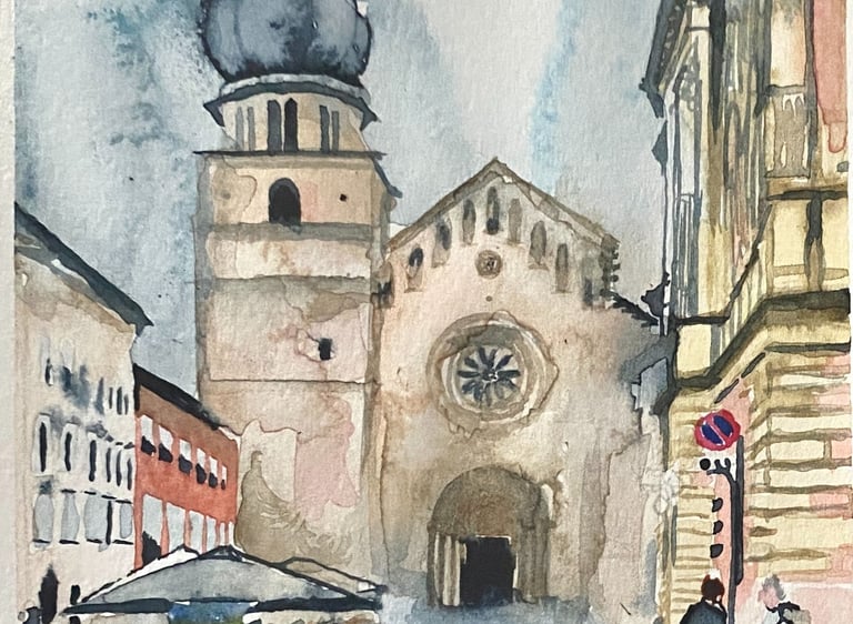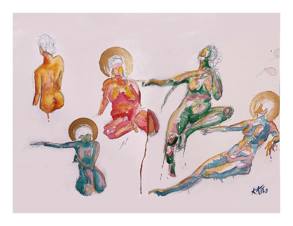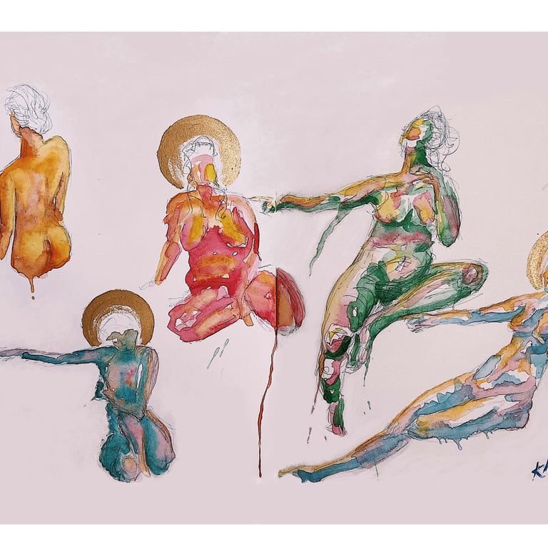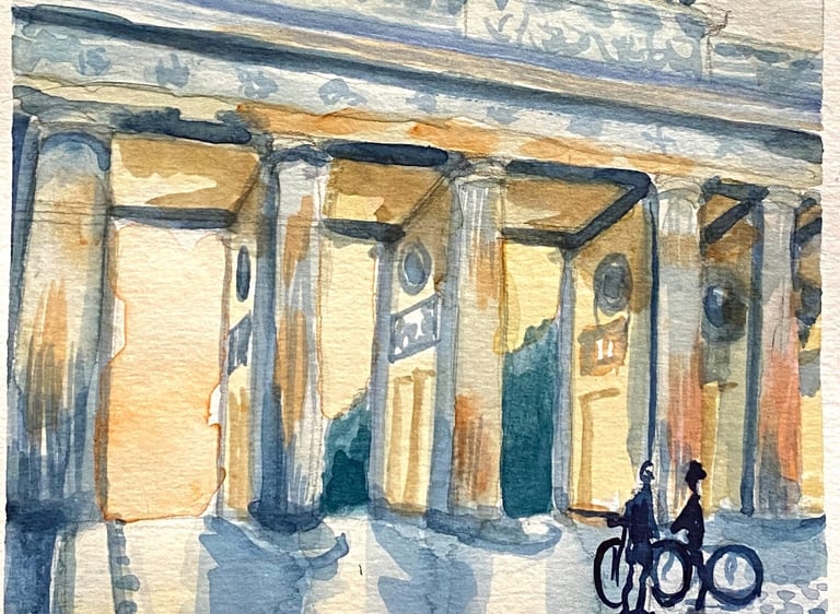 Pen drawing with watercolor accents. 11 inches x 14 inches. 2025.